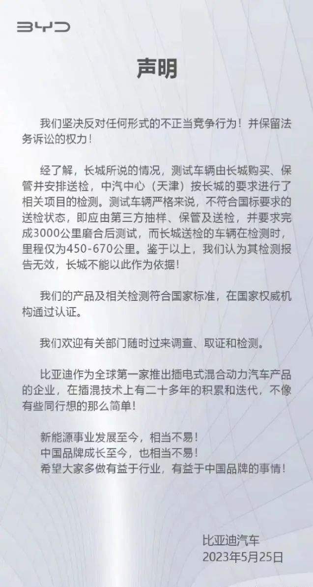 当日,比亚迪迅速出具一份《声明》,核心意思就是,长城汽车的举报“非第三方送检”,并且“里程不够”,有失客观公允。比亚迪还一口咬定相关车型符合国标,有国家权威认证通过。