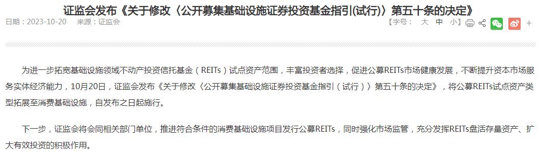 10月20日,证监会官宣修改公募REITs指引,将公募REITs试点资产类型从公共基础设施拓展至消费基础设施,其中商业地产最受瞩目。
