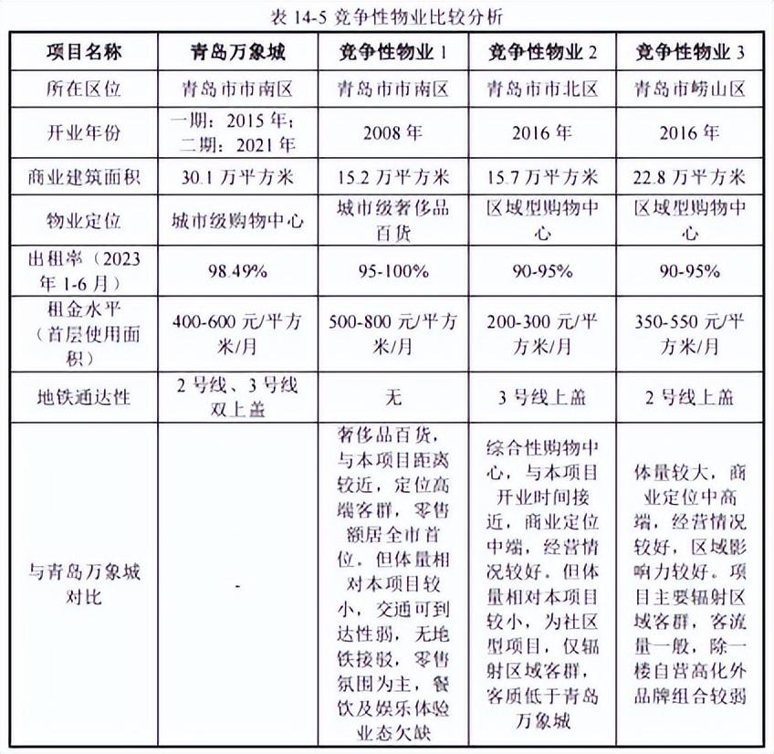 据可比项目横向比较分析看,青岛万象城体量最大,开业虽不是最早的,但今年上半年出租率98.5%及首层租金400-600元/月,均具有较强优势。