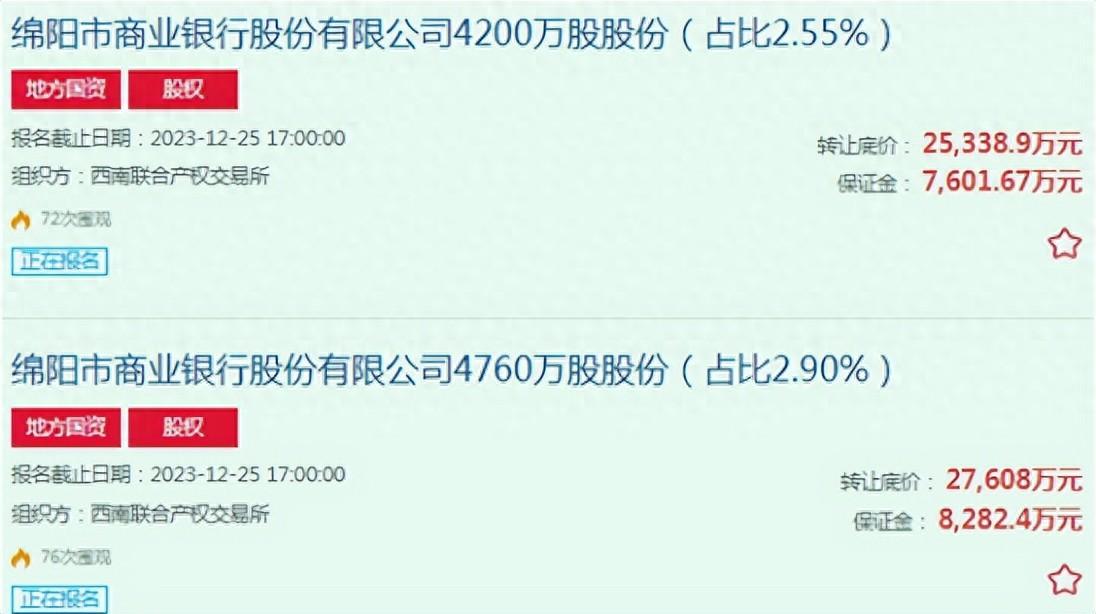 刚刚,绵阳商业银行4760万股、4200万股对外出售,对应占该银行总股本的2.9%、2.55%,报价分别约2.76亿元、2.53亿元,每股对应5.8元、6.03元。