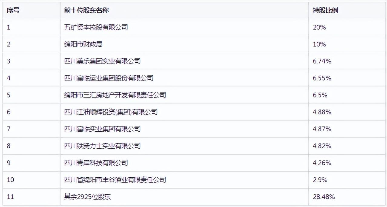 当前,绵阳商业银行第一大股东五矿资本持股20%,第二大股东绵阳市财政局持股10%,第三大股东四川美乐集团持股6.74%,第四大股东富临运业持股6.55%,第五大股东绵阳三汇地产持股6.5%。