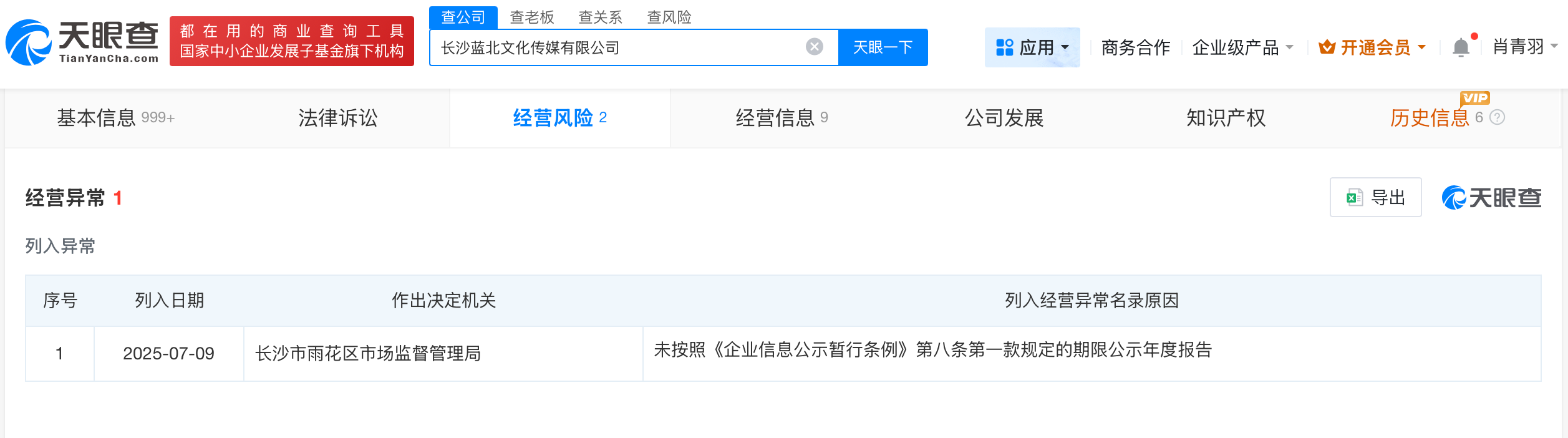 天眼查任职信息显示,蓝战非名下关联7家企业,仅2家为存续状态,分别是长沙辰光电子商务有限公司、长沙蓝北文化传媒有限公司,其余5家企业已注销,其中天津市滨海新区云账户蓝战非文化传媒工作室、长沙仓鼠文化传媒有限公司、长沙战蓝网络科技有限公司于近期注销。经营风险信息显示,今年7月,长沙蓝北文化传媒有限公司因未依照规定的期限公示年度报告,被长沙市雨花区市场监督管理局列入经营异常名录。