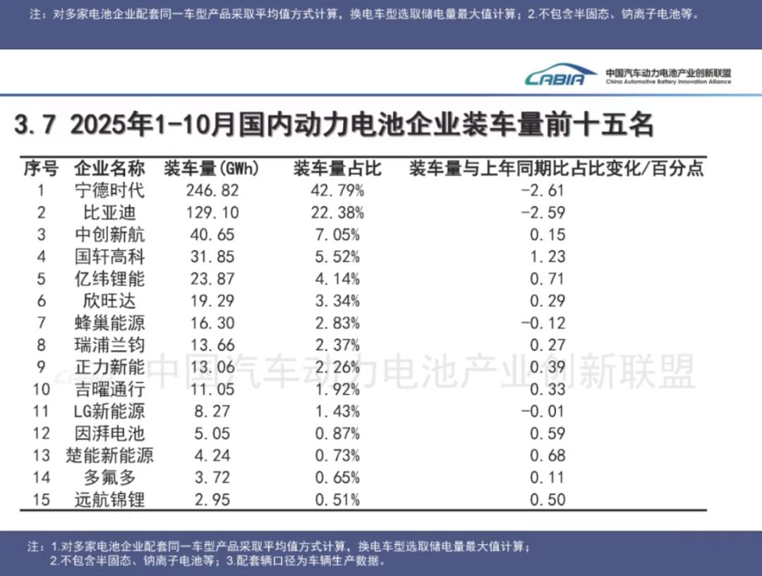 根据中国汽车动力电池产业创新联盟数据,今年1-10月,宁德时代动力电池装车量达246.82GWh,装车量占比为42.79%,较去年同期下降2.61个百分点。