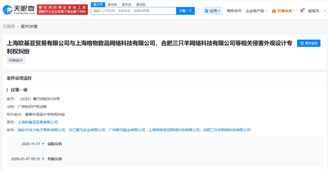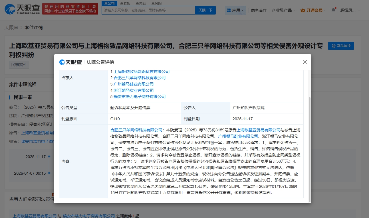 公告显示,该院受理原告上海欧基亚贸易有限公司与被告上海格物致品网络科技有限公司、合肥三只羊网络科技有限公司、广州朝马鞋业有限公司、浙江朝马实业有限公司、瑞安市浩力电子商务有限公司侵害外观设计专利权纠纷一案。原告请求判令被告一、被告二、被告三、被告四立即停止侵犯原告外观设计专利权的行为,包括生产、销售、许诺销售侵权产品的行为,删除侵权链接;请求判令被告五停止侵权、断开案涉侵权的链接,并采取有效措施防止同类型侵权行为的发生;请求判令五被告向原告赔偿侵权的经济损失和原告维权而支出的合理费用合计50万元。