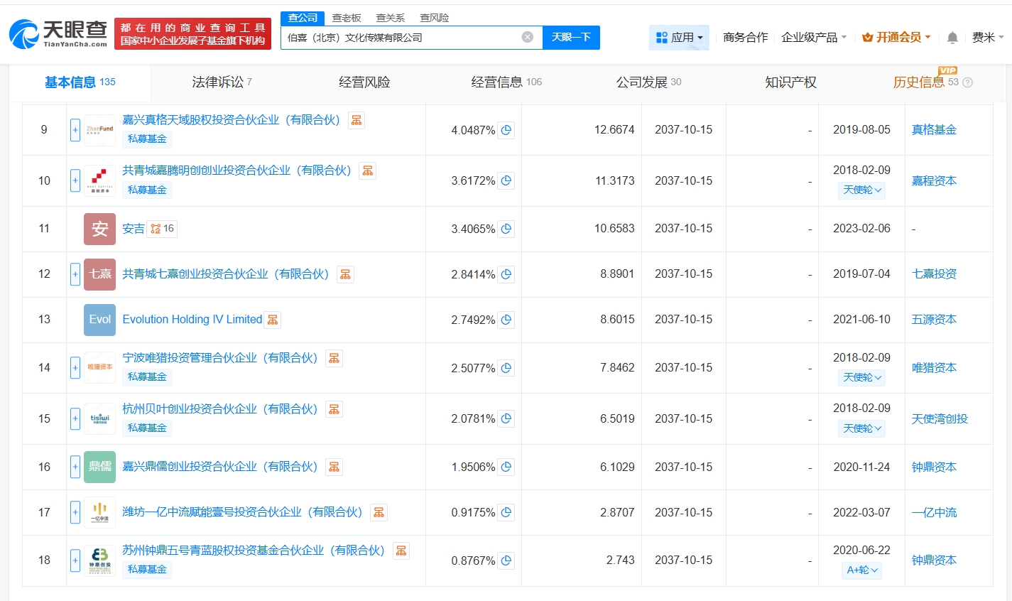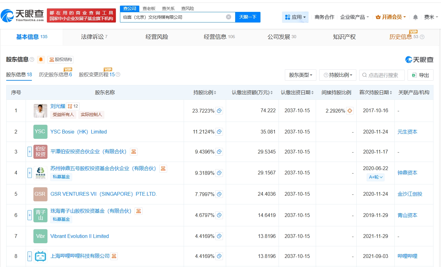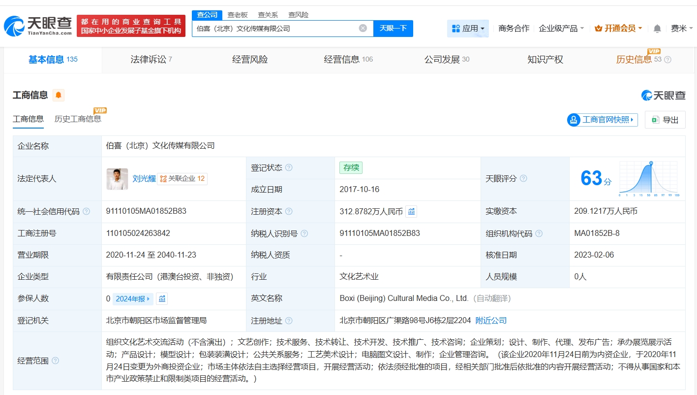 伯喜(北京)文化传媒有限公司成立于2017年10月,注册资本约313万人民币,经营范围包括组织文化艺术交流活动、文艺创作、企业策划等,由刘光耀、YSC Bosie(HK)Limited、安吉等共同持股,其中安吉持股比例约3.4%。