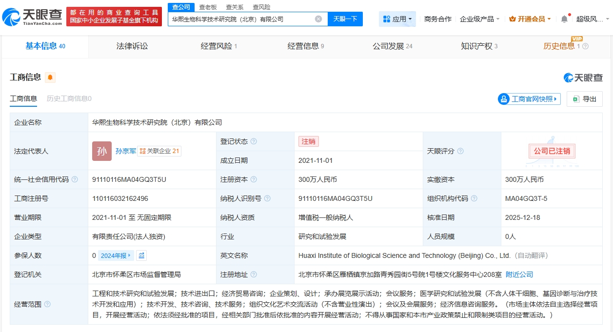 雷达财经讯,天眼查App显示,近日,华熙生物科学技术研究院(北京)有限公司登记状态由存续变更为注销。此前,该公司已发布简易注销公告。