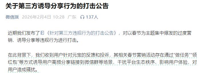 对此,微信官方账号“微信派”当日发布公告称,平台收到用户针对元宝的反馈和投诉,其相关春节营销活动存在通过“做任务”“领红包”等方式,诱导用户高频分享链接到微信群等场景,干扰平台生态秩序、影响用户体验、对用户造成骚扰。