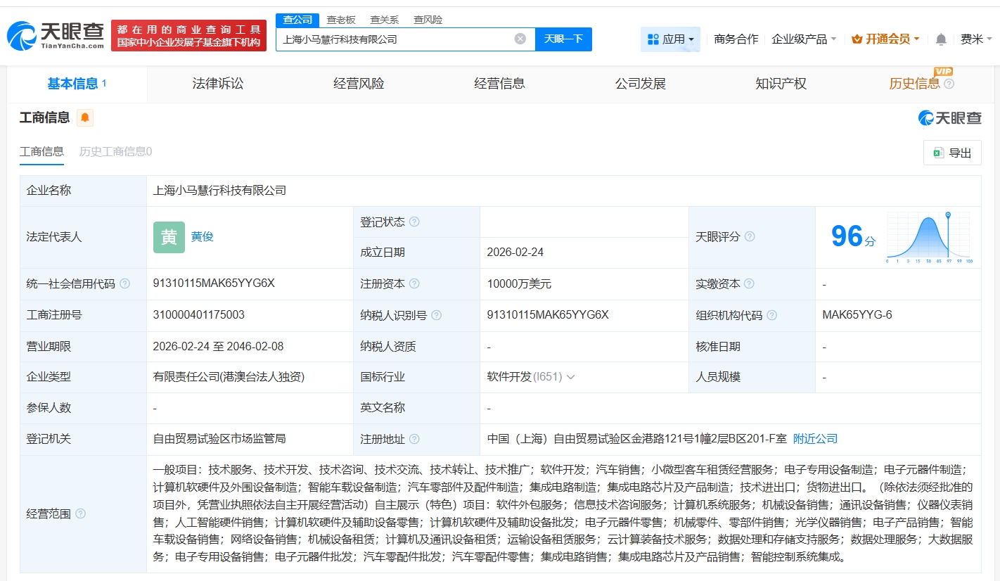 雷达财经讯,天眼查App显示,2月24日,上海小马慧行科技有限公司成立,法定代表人为黄俊,注册资本1亿美元,经营范围包括软件开发、汽车销售、小微型客车租赁经营服务等,由香港小马智行有限公司全资持股。