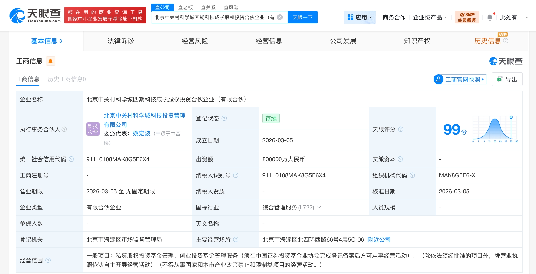 雷达财经讯,天眼查工商信息显示,近日,北京中关村科学城四期科技成长股权投资合伙企业(有限合伙)成立,执行事务合伙人为北京中关村科学城科技投资管理有限公司,出资额80亿人民币,经营范围为私募股权投资基金管理、创业投资基金管理服务。合伙人信息显示,该合伙企业由北京市海淀区国有资产投资集团有限公司、北京中关村科学城科技投资管理有限公司共同出资。