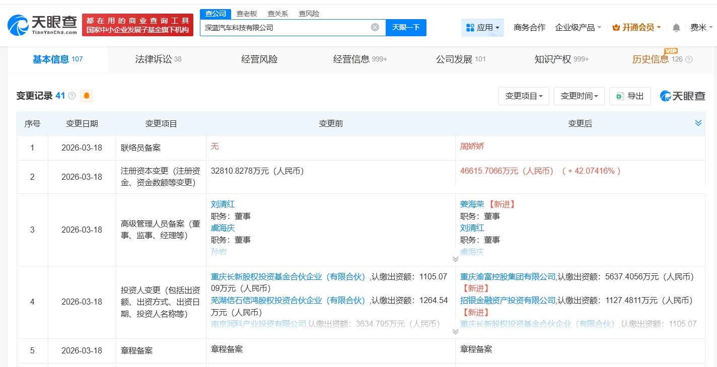 雷达财经讯,天眼查工商信息显示,近日,深蓝汽车科技有限公司发生工商变更,新增重庆渝富控股集团有限公司、招银金融资产投资有限公司为股东,注册资本由约3.3亿人民币增至约4.7亿人民币,增幅约42%。