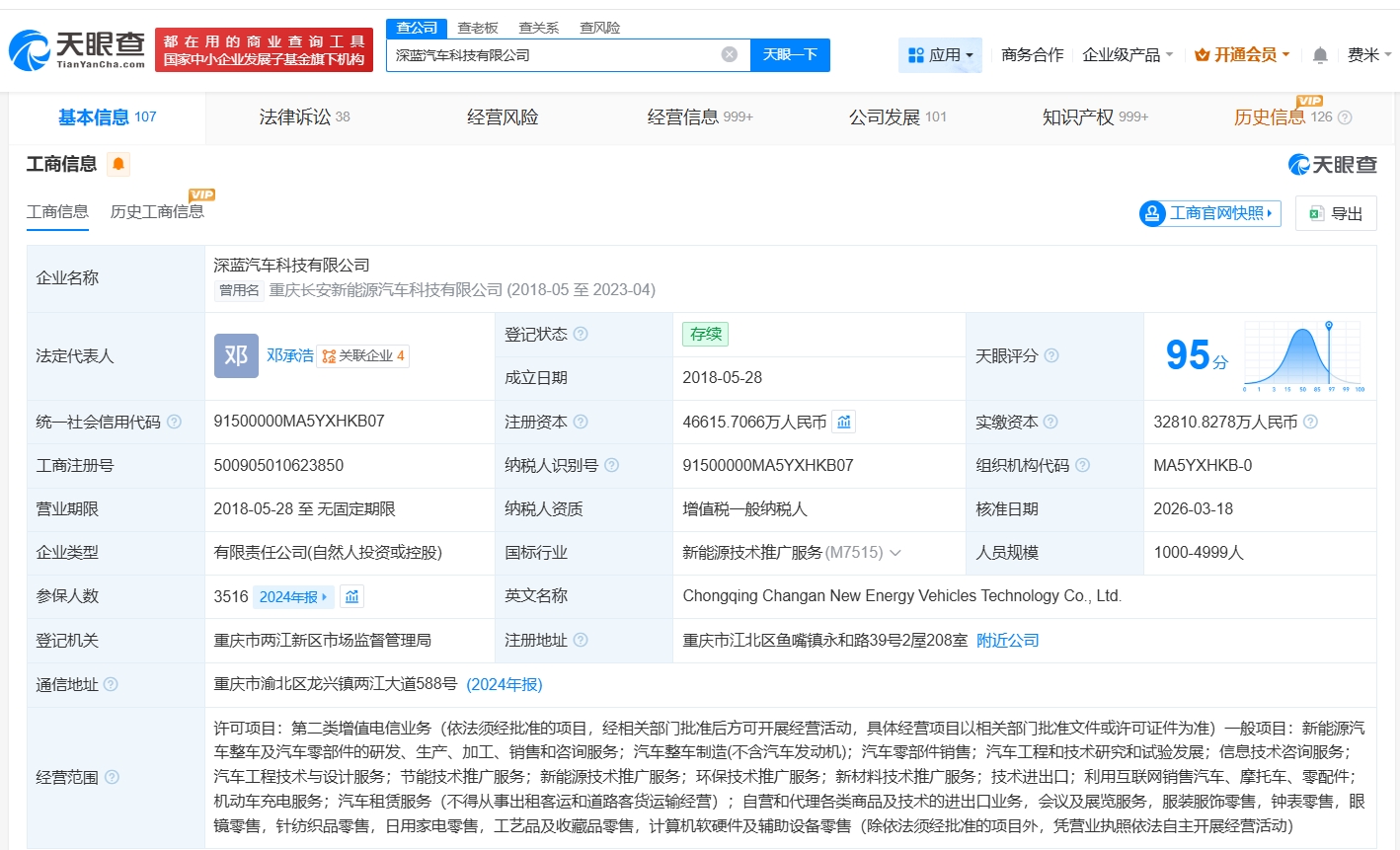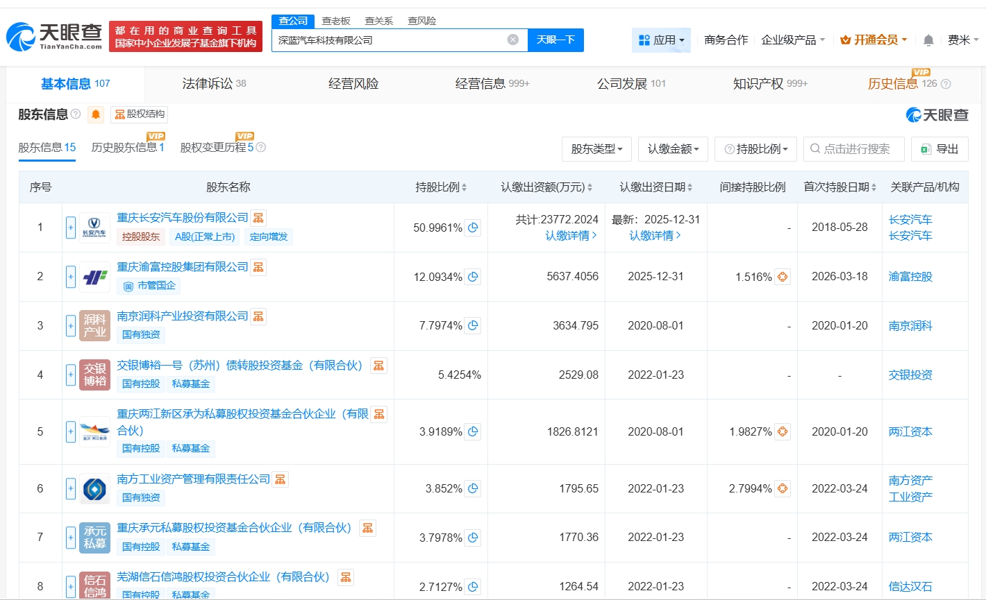 深蓝汽车科技有限公司成立于2018年5月,法定代表人为邓承浩,经营范围包括新能源汽车整车及汽车零部件的研发、生产、加工、销售和咨询服务等。股东信息显示,该公司由长安汽车(000625)、南京润科产业投资有限公司及上述新增股东等共同持股。