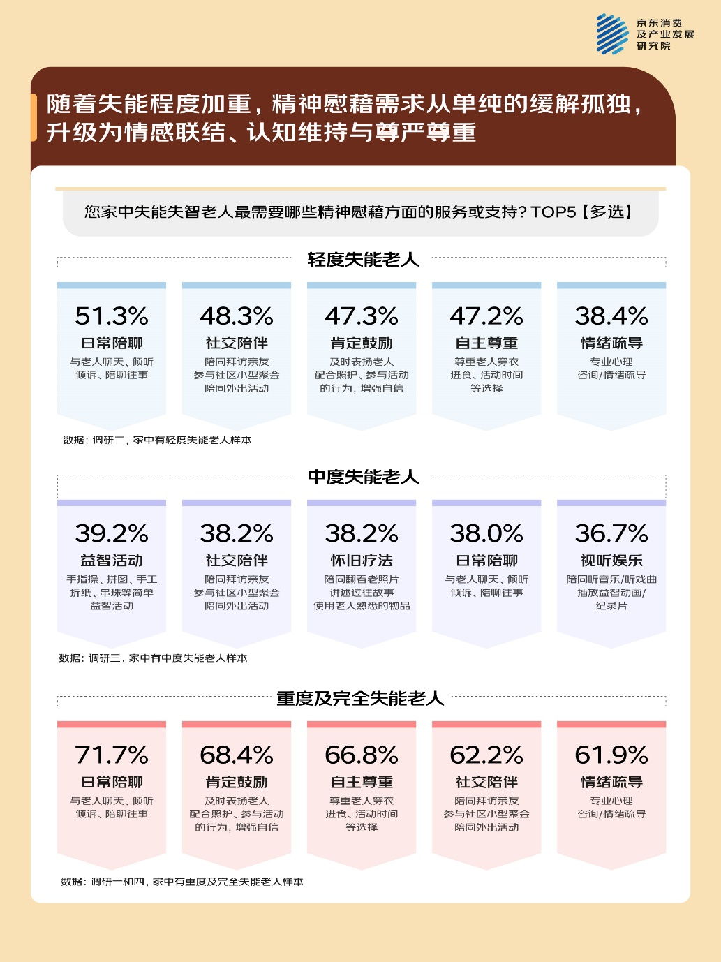 轻度失能老人因行动受限导致社交圈狭窄,孤独感突出,日常陪聊(46.1%)、社交陪伴(43.5%)、肯定鼓励(42.9%)需求较高,他们渴望通过与人交流、参与简单社交,缓解孤独,获得情感支持与自我认同。中度失能老人需求兼顾情感陪伴与认知维持,益智活动(39.2%)、社交陪伴(38.2%)、怀旧疗法(38.2%)、日常陪聊(38.0%)需求占比相近,既排解孤独,也延缓认知退化。重度及完全失能老人以情感联结为核心,兼顾自主性维护与认知激活,日常陪聊(71.7%)、肯定鼓励(68.4%)、自主尊重(66.8%)需求最高,同时社交陪伴(62.2%)、情绪疏导(61.9%)需求突出,怀旧疗法(56.2%)则成为维持失智老人心智功能的重要方式。(数据样本:调研一、二、三、四)