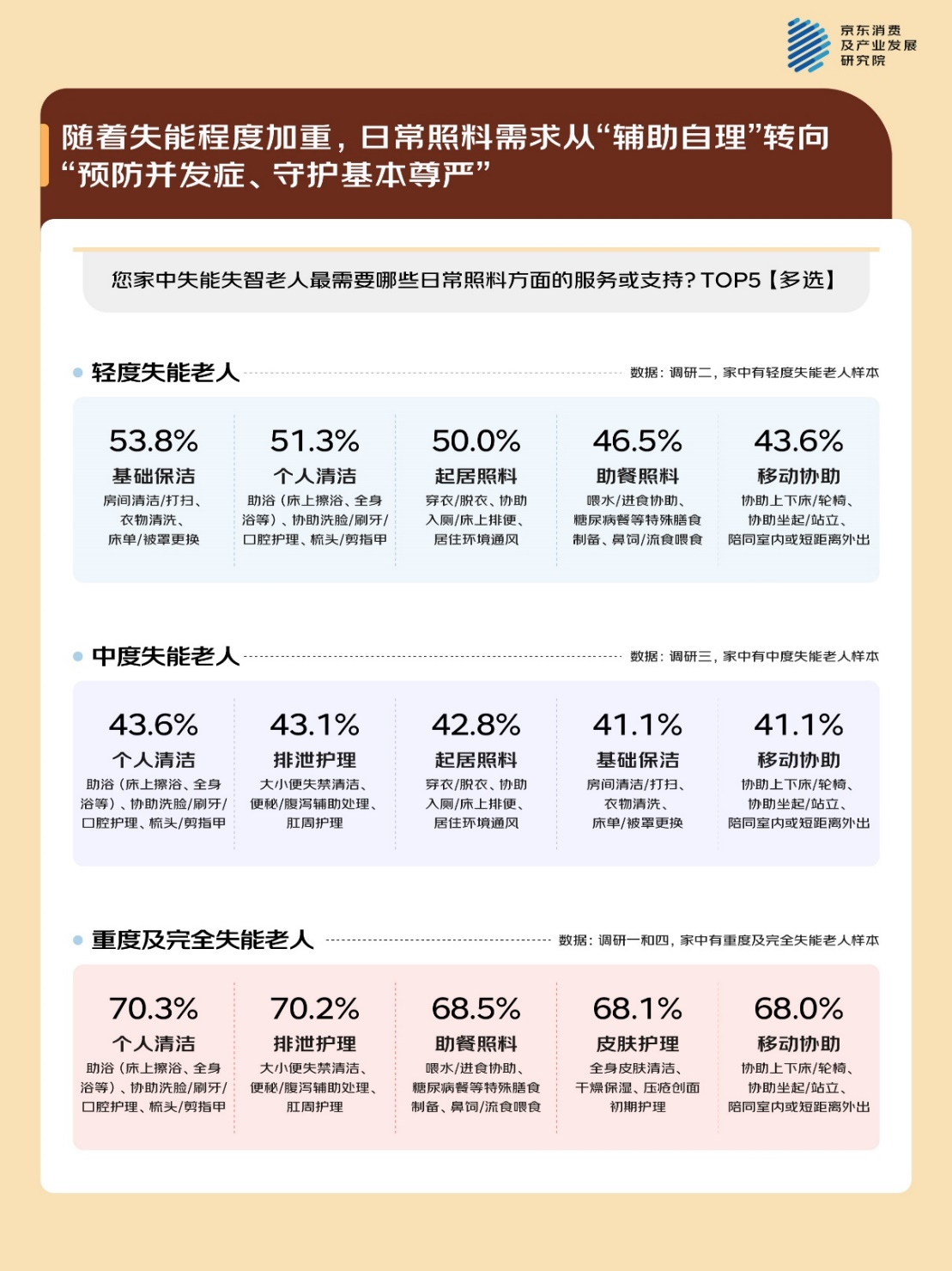 日常照料是失能失智老人居家生活的基础。随着失能程度加重,需求从“辅助自理”逐步转向“预防并发症、守护基本尊严”。