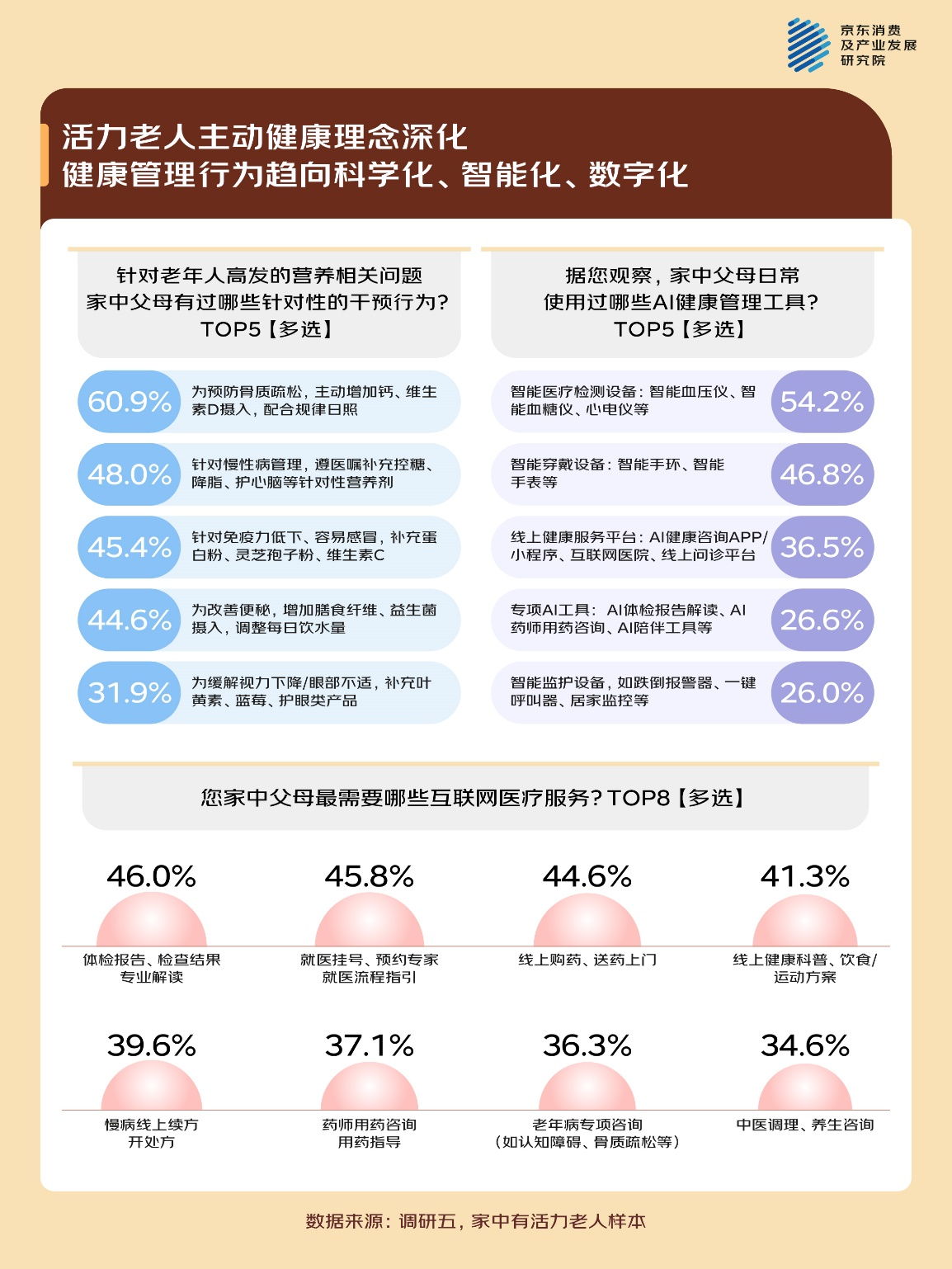 营养保健品是很多活力老人主动健康管理的首要选择,69.3%的老年人重视营养保健品的辅助支持,对日常饮食、滋补、养生做精细化规划。活力老人对营养保健品的消费更加理性精准,49.5%在决策时优先看重性价比与实用性,48.2%具备更科学的认知,能够理性看待营养保健产品的辅助调理作用。同时,需求正从基础通用型营养补充,向适配慢病、生理特点的精准专项营养干预升级。在调研中,有60.9%的老人为预防骨质疏松,会主动增加钙、维生素D的摄入;48.0%的老人会加强慢病管理,遵医嘱补充控糖、降脂、护心脑等针对性营养剂;还有45.4%的老人适度补充蛋白粉、蜂胶等产品以提高免疫力。此外,专业化定制营养服务需求增加,71.1%的受访者希望有一对一专业营养师定制化服务并愿意为之付费。京东健康全职营养师、AI营养师“小晶”,能够为老年群体提供专业、精准、个性化的营养咨询与健康管理服务,现已累计服务超2000万用户。