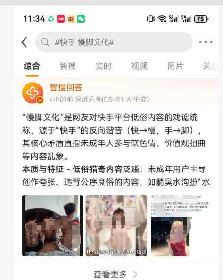 据微博智搜回答,“慢脚文化”是网友对快手平台低俗内容的戏谑统称,指代一系列被打上“风格夸张”“畸形审美”等标签的短视频。