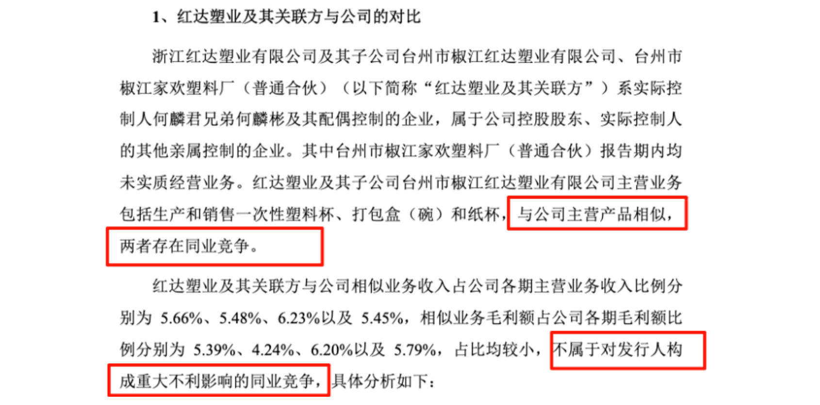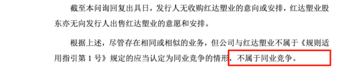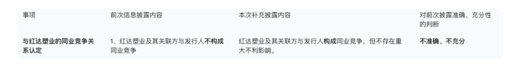 二轮回复中一份极为关键的表格,清晰地记录了这一反转 。“前次(首轮)信息披露内容”为“红达塑业及其关联方与发行人不构成同业竞争”,而“本次(二轮)补充披露内容”则明确修正为“红达塑业及其关联方与发行人构成同业竞争,但不存在重大不利影响”。