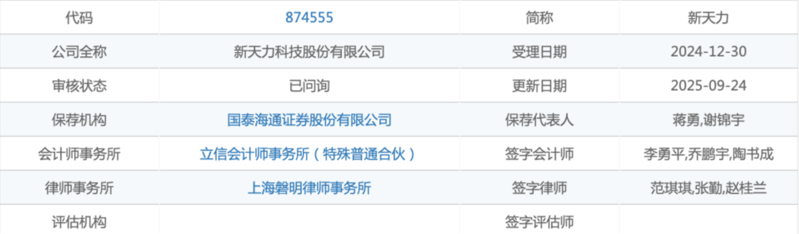 新天力保荐机构为国泰海通证券股份有限公司(下称“国泰海通证券”)保荐代表人蒋勇,谢锦宇,会计师事务所立信会计师事务所(特殊普通合伙)签字会计师李勇平,乔鹏宇,陶书成,律师事务所上海磐明律师事务所签字律师范琪琪,张勤,赵桂兰.