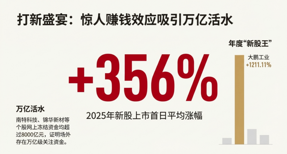 打新收益率爆表:2025年被称为北交所打新的“黄金年份”。新股上市首日平均涨幅高达356%。这种惊人的赚钱效应,使得打新成为了无风险套利的乐园。