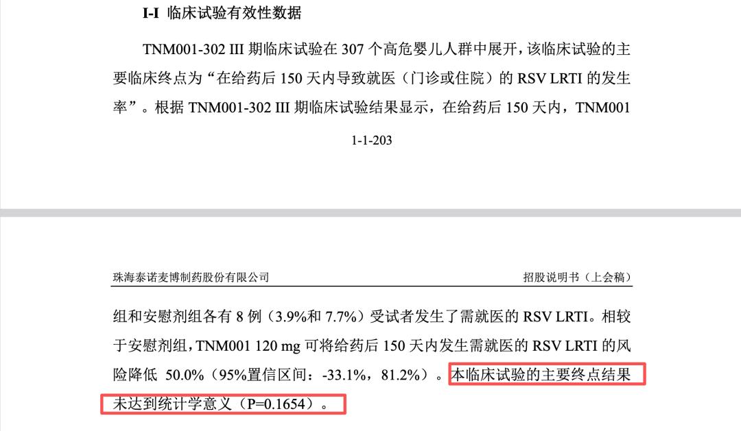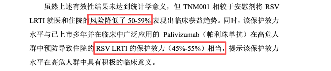 然而,在面临主要临床终点未能达到统计学意义的重大实质性风险时,泰诺麦博在招股书及问询回复中并未秉持客观、中立的原则进行充分的风险揭示,反而采用了一系列极具主观诱导性与粉饰性的文字进行定性描述。披露文件多次强调“TNM001相较于安慰剂将RSV LRTI就医和住院的风险降低了50-59%,表现出临床获益趋势”。更为疑惑的是,泰诺麦博将其与已上市多年的帕利珠单抗(Palivizumab)“45%-55%”的保护效力进行直接的横向数值比对,进而推导出“提示该保护效力水平相当”的结论,并以此为核心依据向国家药监局药品审评中心(CDE)递交了新药上市申请(NDA)且获受理。