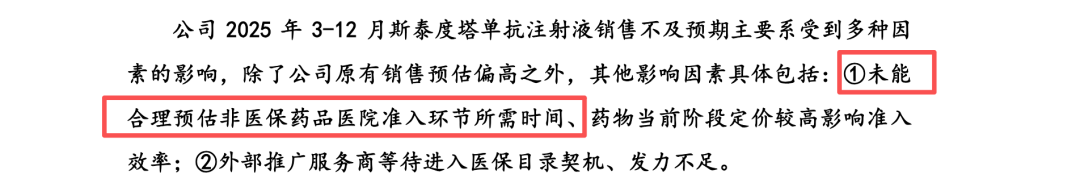 根据招股书及第二轮问询回复明确披露,2025年3-12月期间,斯泰度塔单抗的实际销量为15.90万瓶,仅实现首次申报前原预测销量(27.89万瓶)的约57%,而在2025年3-9月期间,实际销量更是仅完成预期的47.60%。更为触目惊心的是,在该期间内,外部推广服务商团队的原预期销量目标达成率仅为极其反常的6.42%。泰诺麦博将这一断崖式下滑轻描淡写地归结为“未能合理预估非医保药品医院准入环节所需时间”、“较高定价影响”以及“推广服务商等待进入医保目录契机、倾向于纳入医保后再发力”。