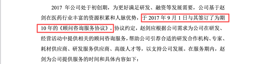 根据问询回复披露,泰诺麦博于2017年处于初创期时(后经补充续签,服务期限明确为自2019年12月1日起至2029年11月30日止,长达10年),与自然人赵剑(Zhao Jian)签署了《顾问咨询服务协议》。该合同的报酬结构极为丰厚,不仅包括总计高达300万元人民币的固定顾问费(分年支付完毕),还包含泰诺麦博向其授予的24.75万股股票期权激励(行权价格为4.41元/股)。