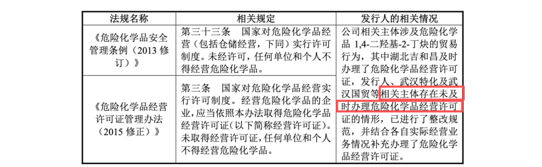 企业在没有获得法定生产资质前,便将大量受控化学品堂而皇之地推向市场,其背后是否伴随着对各级检查体系的系统性隐瞒(属地应城市长江埠精细化工园区,安全生产监管主体为应城市应急管理局是否在数年未取得资质前知晓此时?)。国信证券郭昱与李建国试图通过事后补办证书来掩盖这长达三年的非法生产事实,并以此论证公司符合发行条件。