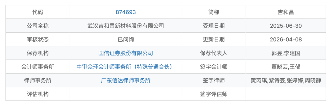 吉和昌保荐机构是国信证券股份有限公司,保荐代表人为郭昱和李建国。会计师事务所是中审众环会计师事务所(特殊普通合伙),签字会计师为董晓芸和王郁。