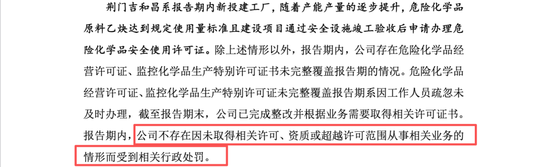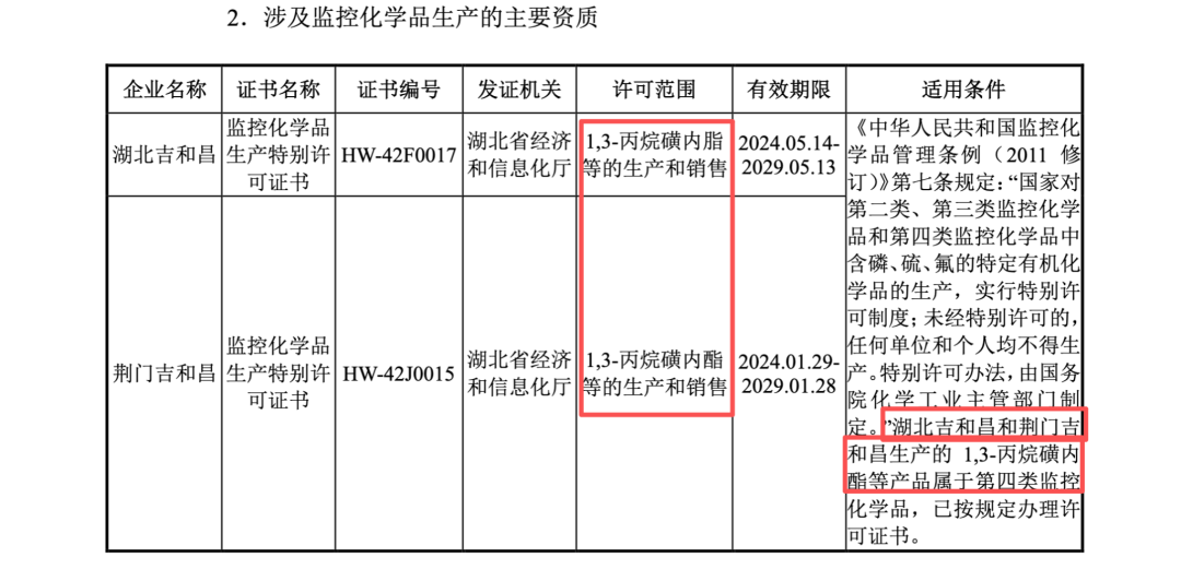 在所有违规事项中,荆门吉和昌生产1,3-丙烷磺内酯(1,3-PS)的违规行为性质最为恶劣。1,3-丙烷磺内酯属于国家严格管制的第四类监控化学品。依据《中华人民共和国监控化学品管理条例》等相关法律法规,此类化学品的生产必须在项目建设投产前取得特别许可证书。然而,事实证明,荆门吉和昌在未取得该特别许可证的情况下,于2022年至2024年的长达三年时间里,持续进行无证非法生产。迟至2025年1月,该子公司才最终补齐相关许可证。