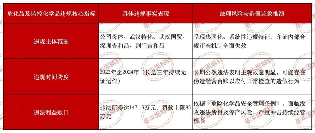 在非财务信息的纵深排查中,企业的生产经营合法合规性是不可逾越的红线。吉和昌在精细化工领域的日常运营,或暴露出令人触目惊心的系统性、长期性、多主体违法违规事实。这些事实不仅触及国家公共安全与生态环境底线,更折射出吉和昌实控人宋文超与戴荣明对法律尊严的藐视,以及在合规体系建设上的不足。