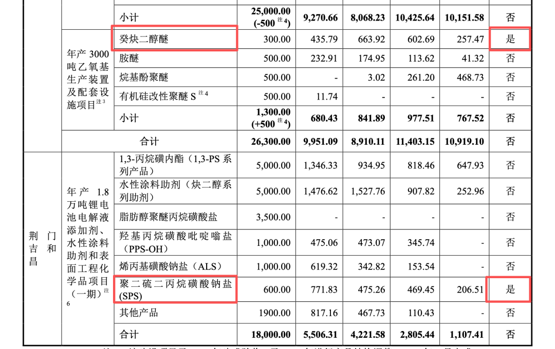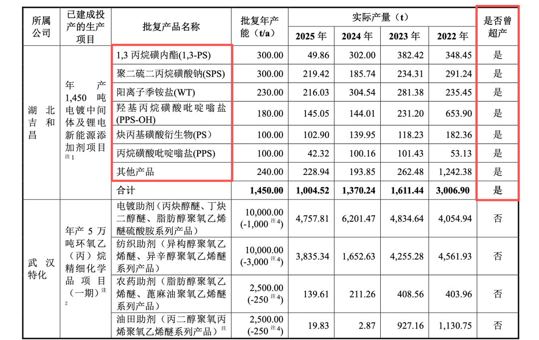 至2024年乃至2025年上半年,湖北吉和昌的核心细分产品,包括1,3-丙烷磺内酯(1,3-PS)、聚二硫二丙烷磺酸钠(SPS)、阳离子季铵盐(WT)、羟基丙烷磺酸吡啶嗡盐(PPS-OH)等,依旧持续大幅超出批复产能。同时,荆门吉和昌在2025年上半年,其SPS产品的产量甚至超出折算批复产能高达31.23%。武汉特化亦以“生产工艺相通”为借口,放任细分产品炔二醇醚产量持续越界。