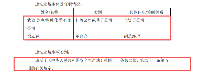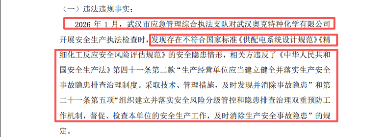 基于上述违法事实,2026年2月13日,武汉市应急管理局正式下达《行政处罚决定书》,对武汉特化依法处以罚款,并对主要负责人梁立春处以罚款,同时责令限期消除隐患并改正。