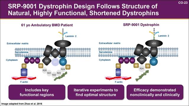 尽管抗肌萎缩蛋白被认为是一种大蛋白,但其只要表达出了这些关键锚定点,即使删除了部分的重复区域也可以保持一定的功能。例如许多轻症的DMD患者,就是因为能够部分表达具有一定功能的DMD蛋白,从而获得了较好的生理水平。SRP-9001就是受到这点的启发,设计出的截短型的DMD蛋白,其中包含了肌动蛋白结合域区域ABD、完整的肌膜结合区域 R1‑R3、富含半胱氨酸的区域CR以及柔性的铰链H1、H2 和 H4。