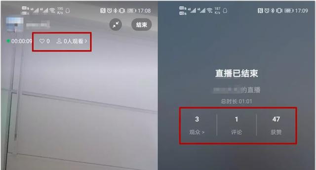 直播间结束后,直播间界面会显示直播相关的基础数据。如观众、评论、获赞、时长等数据。
