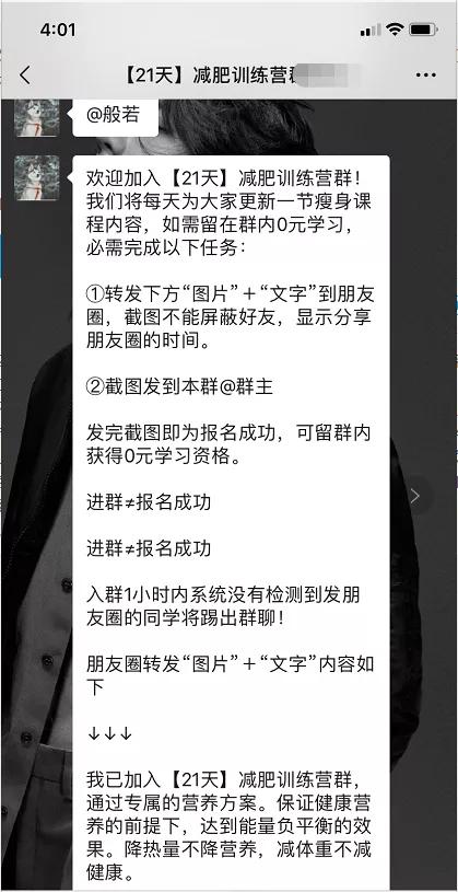 同时,我们还可以安排优秀的嘉宾或者老师进群分享瘦身经验或健身知识,配合话题讨论和答疑,就能够达成目的。