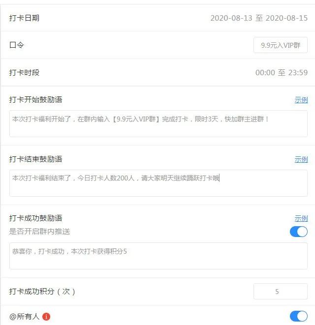 想办法让群友有参与感,仪式感,组织感,存在感,所以要善于利用社群管理工具来提高群成员的参与度。可以设置每日签到,打卡学习等功能,抓住群成员刚入群的好奇心,给他们制定一些简单的任务,提升社群整体活跃度的同时,还能让群成员养成每天关注社群的习惯。