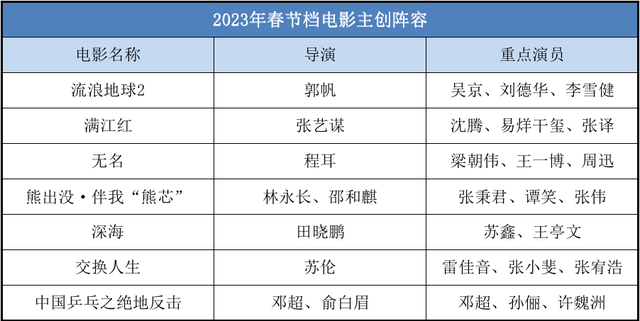 《流浪地球2》28亿至38亿元、《满江红》15亿至20亿元、《无名》3.5亿至6亿元、《熊出没·伴我“熊芯”》6亿至8亿元、《深海》14.5亿至24亿元、《交换人生》12亿至14亿元。