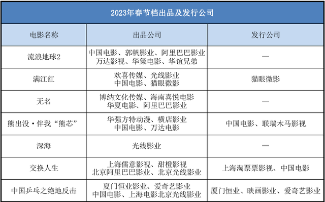 光线影业参与了今年7部影片中的4部,分别是《流浪地球2》《满江红》《交换人生》和《中国乒乓之绝地反击》;