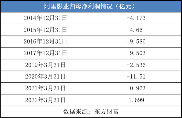 公司财报也验证了这些影片的“钱景”,据阿里影业2021财年年报显示,截至2022年3月底,公司实现营收36.52亿,同比增长28%;归母净利润1.699亿,是过去六个财年以来唯一一个盈利的财年。
