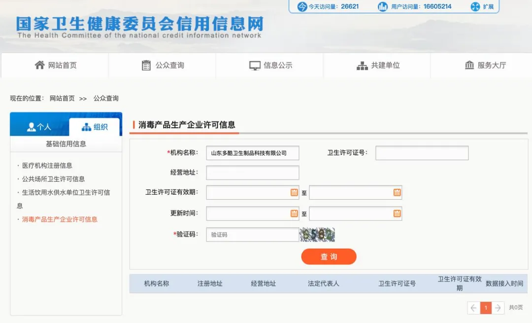 BeBeBus纸尿裤包装袋展示的信息,山东多酷公司的卫生许可证号为“鲁卫消证字[2021]第0133号”。但笔者发现,在国家卫生健康委员会信用信息网上,山东多酷公司的消毒产品生产企业许可证信息却查不到。