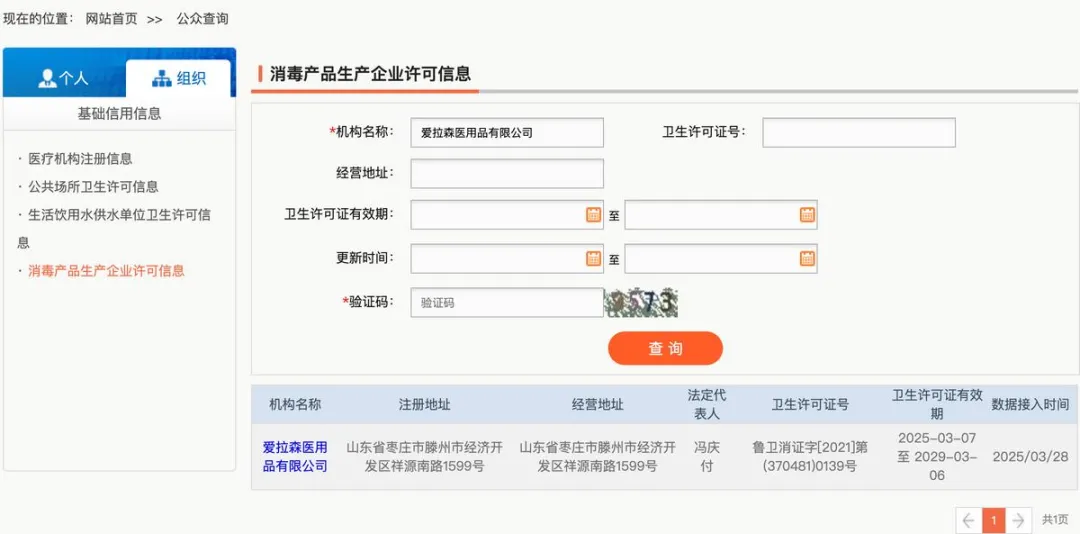 据贝多财经早前了解,爱拉森公司的卫生许可证号为“鲁卫消证字[2021]第0139号”,有效期为2021年3月11日至2025年3月10日(换证后边的为2025年3月7日至2029年3月6日)。与之对应的是,在国家卫生健康委员会信用信息网验证时可查到该结果。