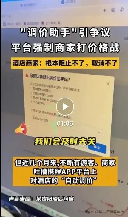 比如携程为了保障客房售卖价格相对其他平台如美团、飞猪等更低,自动抓取美团平台酒店价格后,通过调价助手进行跟价,且未经商家同意强制变更客房售卖价格,很多酒店商家只有在用户下订单到线下完成履约动作的时候才知道被携程私自调整了价格。