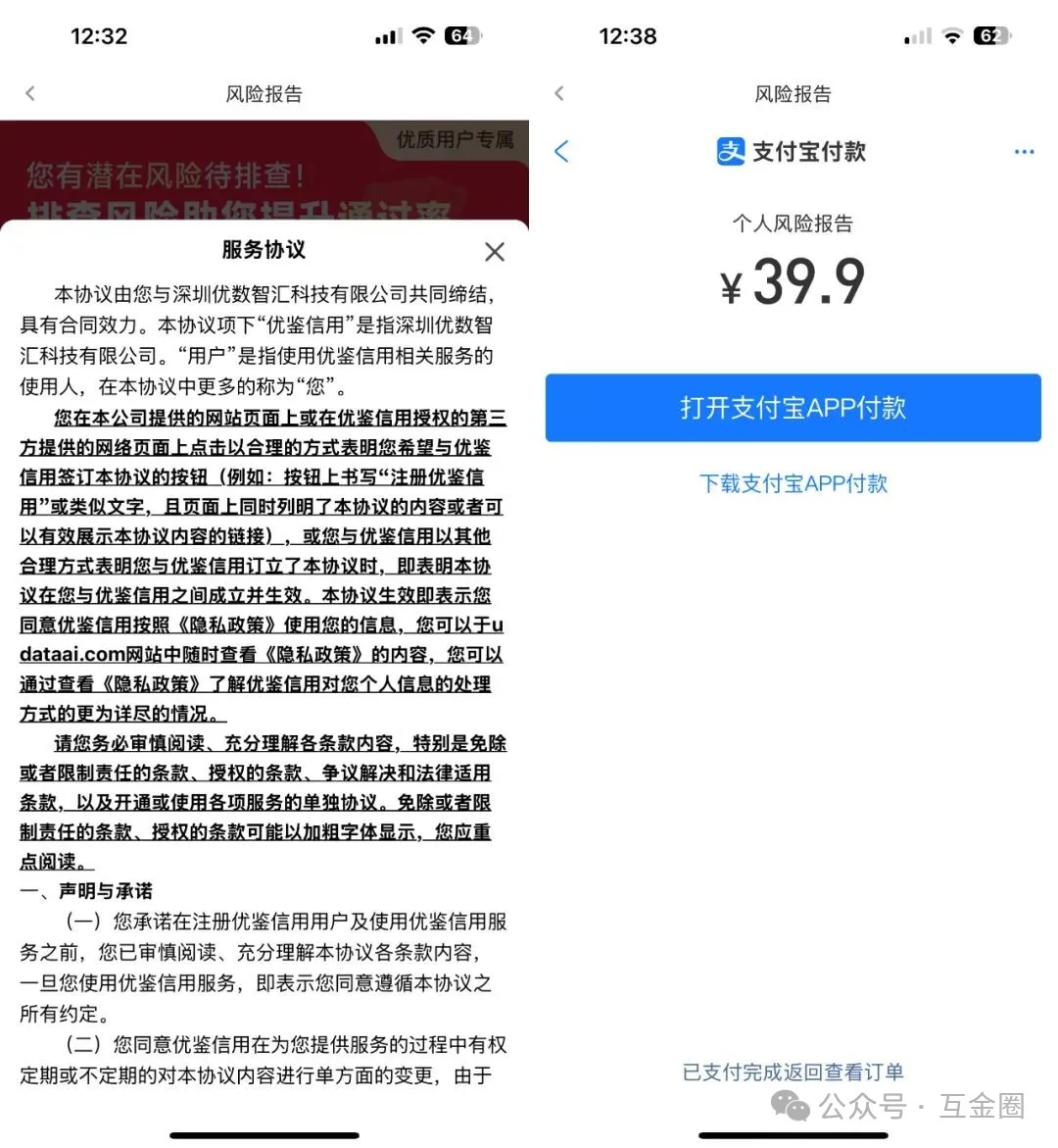 「桃多多」首页,醒目提示“您的优先放款特权待激活”,并声称“一键排查风险,助力提速89%”。该服务由深圳优数智汇科技有限公司提供,每份个人风险报告售价为39.9元。