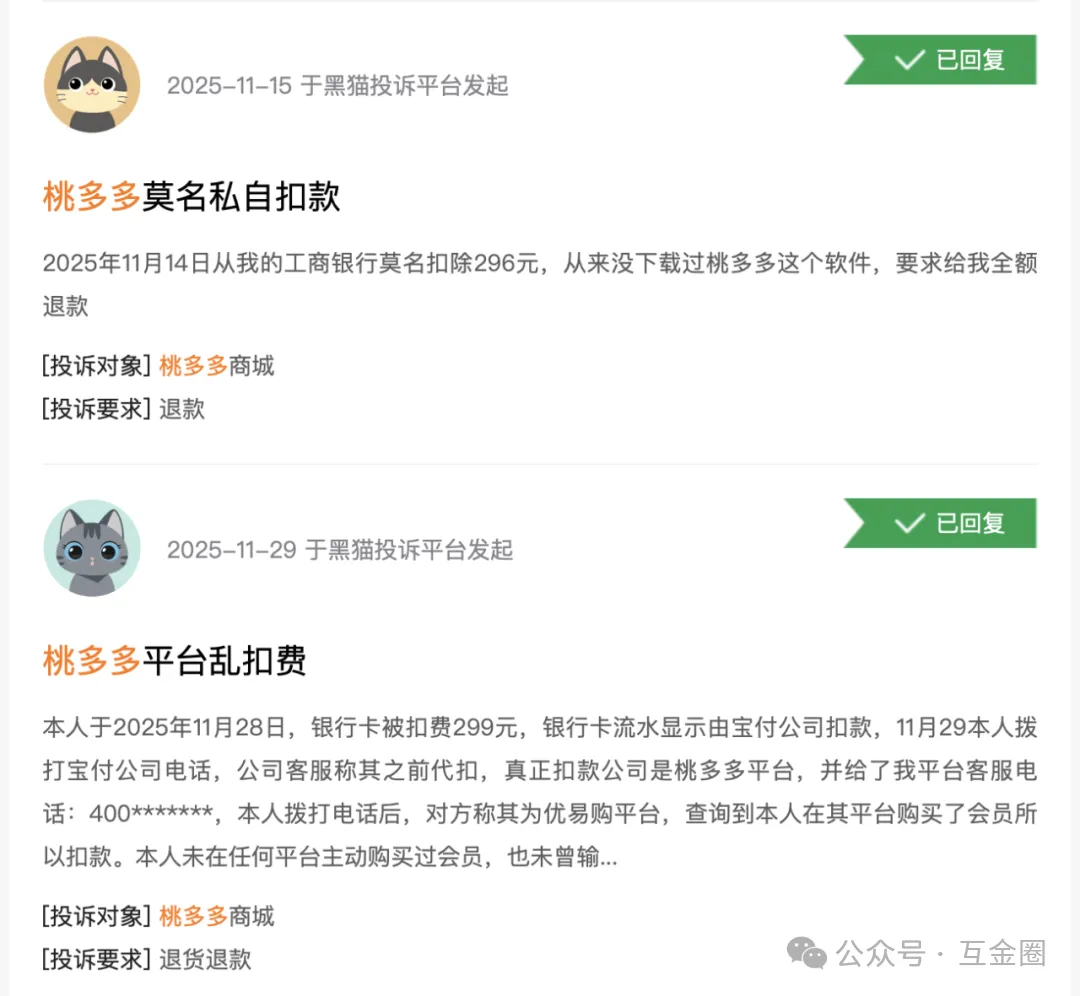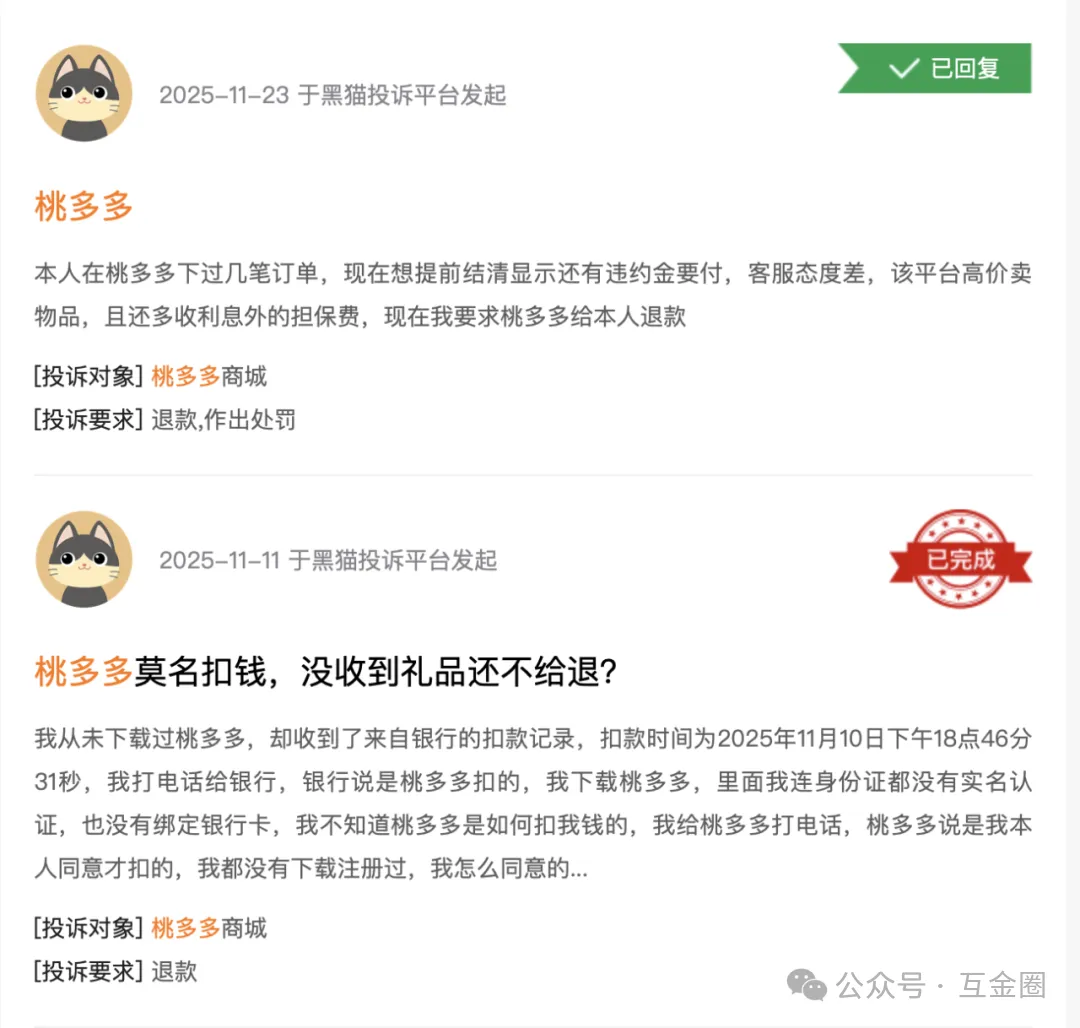 黑猫投诉(新浪旗下)相关信息显示:有用户投诉称,即使未曾下载过「桃多多」,却被「桃多多」扣费;