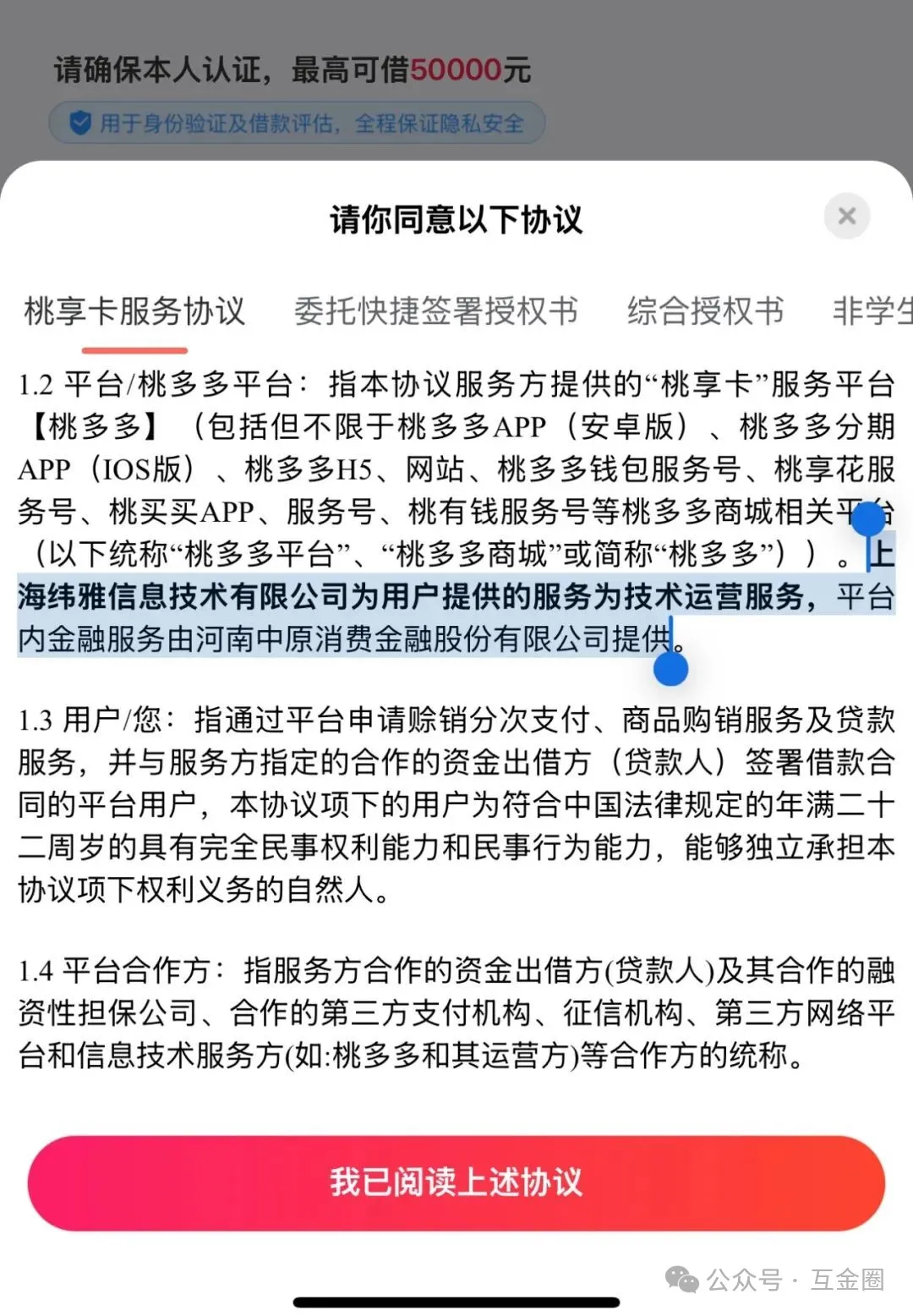 从协议内容来看,「桃多多」主要做的是将用户导流给金融机构——“中原消金”,由后者来放款。