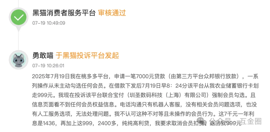 例如,一名用户在「桃多多」平台申请7000元贷款(由众邦银行提供),但在贷款发放后,平台从其银行卡中扣除999元的会员费。