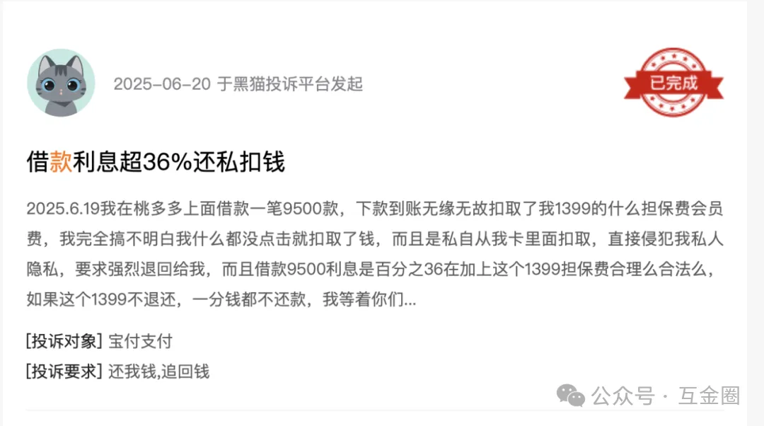 投诉编号 17384305616 显示该用户借款9500元,利息是36%,额外又被扣取了1399元的担保费。