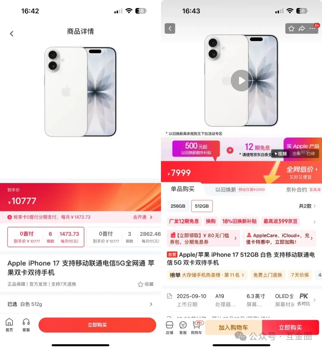 例如,iPhone 17白色512G在「桃多多」上的售价为10777元,而京东官方售价仅为7999元,价差超2700元。