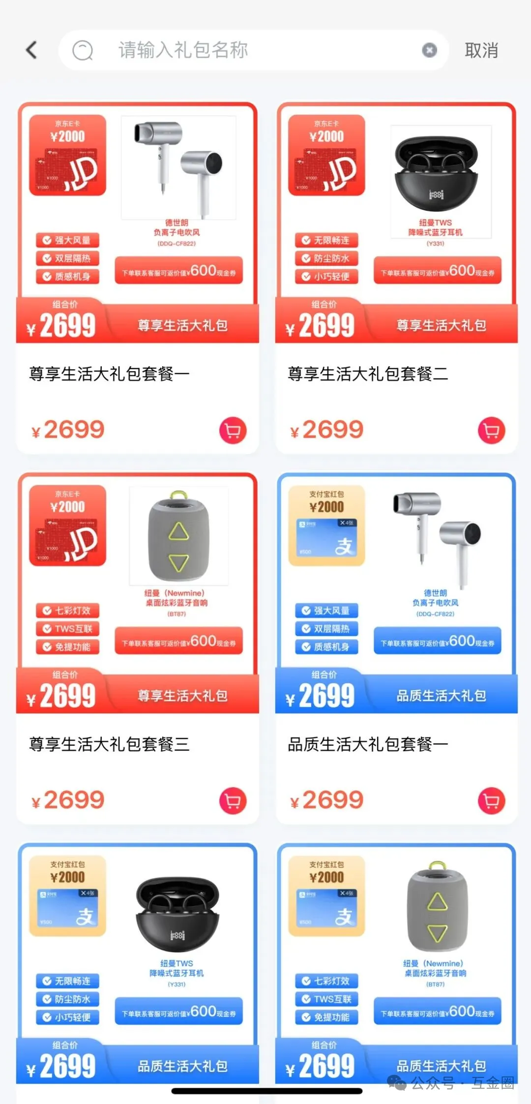 例如,其售价2699元生活权益大礼包,内容包含2000元京东卡+博世朗负离子电吹风(这款小众品牌电吹风,截止发稿,「互金圈」在京东,天猫,拼多多三家头部电商平台都搜不到这个品牌的电吹风。其价格更无从参考)。