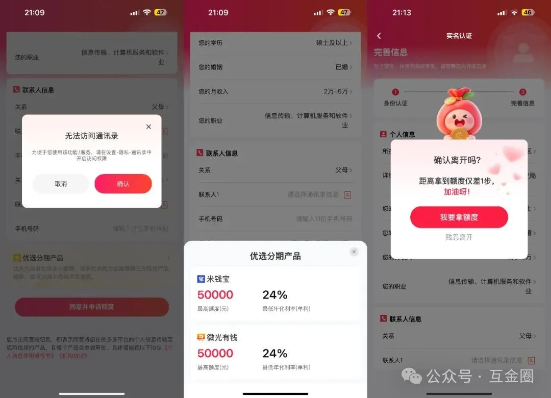 12月11日「互金圈」实测发现,用户在「桃多多」平台申请借款时,需先完成身份证正反面提交、人脸识别等实名认证环节,而进入联系人信息填写阶段后,平台要求强制开启通讯录权限并调取联系人名单,否则无法继续操作查询可借款额度。