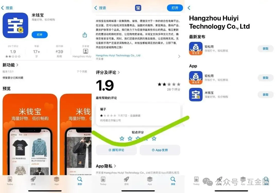 在苹果 App Store 搜索到一款同名APP——「米钱包」,发布方为Hangzhou HuiyiTechnology Co., Ltd(杭州惠翊科技有限公司),由该公司发布上架的应用还有——「轻松用」。